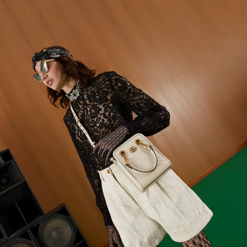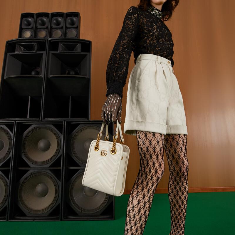 "Gucci's March of Love" new fashion series interprets many of the brand's recognizable elements into a mini version of the design, reproducing the trend of the 90s. Crafted in white quilted leather, this GG Marmont bag combines a soft yet structured rectangular shape with a noble and small Double G hardware. Double handles and a detachable leather shoulder strap add more styling options to the entire bag.