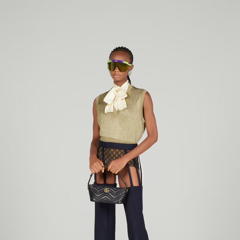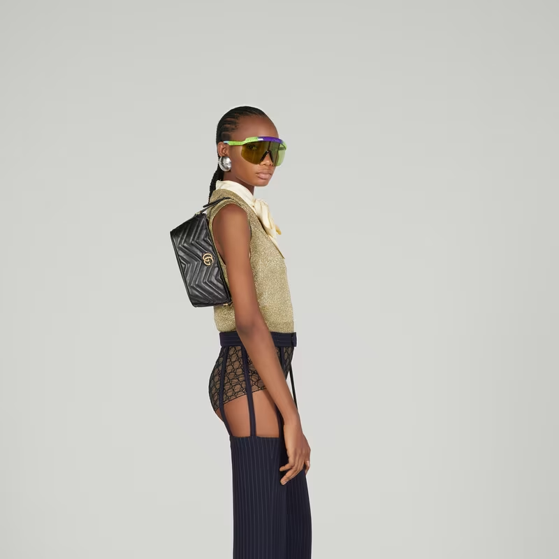 With its recognizable matelassé fabric and Double G hardware, the GG Marmont has become synonymous with the House. Continuously reinvented through the seasons, new shapes are introduced within this signature line, matching Gucci's contemporary vision. Presented here in black leather, it's further enriched with antique gold-toned details.