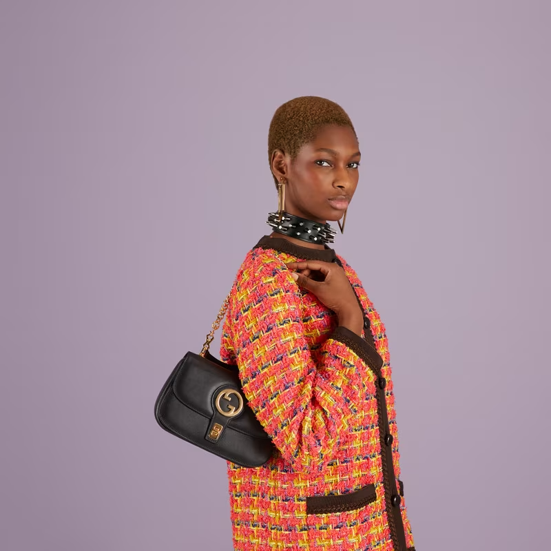 Vintage elements are paired with archival details. This shoulder bag pairs a delicate chain strap with smooth black leather to infuse the accessory with a timeless, yet contemporary feel. The Round Interlocking G, an archival code, sits atop the central buckle closure.