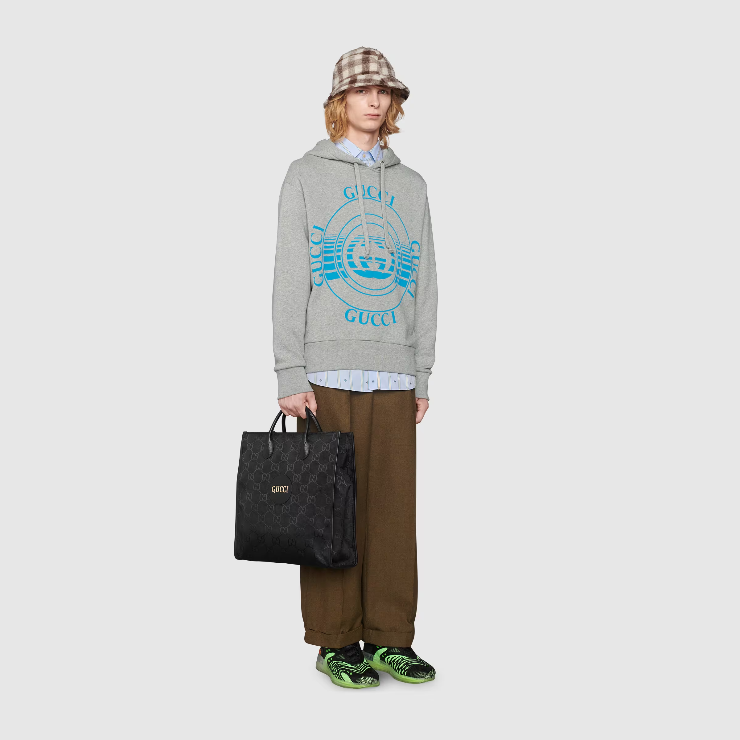 A line of accessories and ready-to-wear is presented for Pre-Fall 2020 made from recycled materials and trims, supporting the House's commitment to sustainability. Gucci Off The Grid is the first collection from Gucci Circular Lines—a concept created to support the House's vision for circular production. Designed for those mindful of their environmental impact, Gucci Off The Grid uses recycled, organic, bio-based and sustainably sourced materials. Regenerated nylon, crafted using recycled sewing thread and trims displays the GG pattern against an opaque background in black. Crafted into a long double handled tote bag, the shape is finished with an optional shoulder strap that can be detached on one side and stored within the bag.